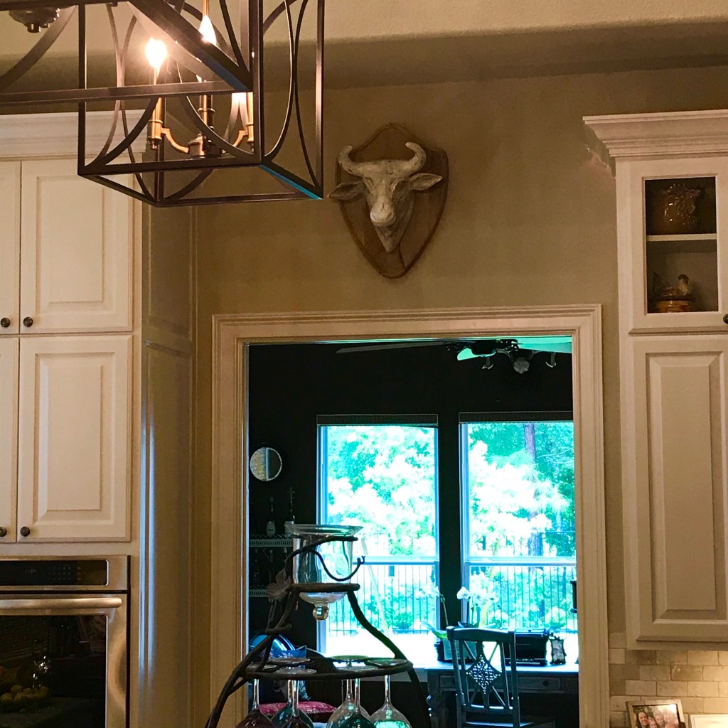 Last weekend one of my dear neighbors moved and right there on her curb were TREASURES โฆ well I rushed over, of course, and retrieved this lovely plaster cow head from the garbage man. I think it is perfect over the door between the kitchen and sitting room. So much joy and it was FREE.